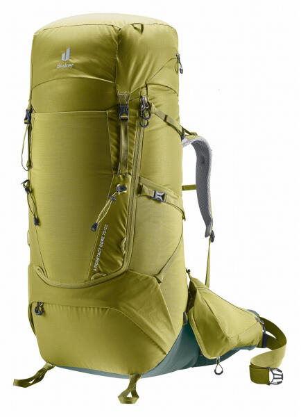 Az Y alakú váz a csípő köré tekeredő mozgatható csípőpántokkal és a Deuter ergonomikus, trapéz alakú derékpárnájával kombinálva hatékonyan elosztja és stabilizálja a terhelést. Az elülső, teljes hosszában J alakú cipzárnak köszönhetően a tartalom könnyen megtalálható a főrekesz alatt. A nagyméretű, kivehető csípőövi zsebek (3 l) további tárolóhelyet biztosítanak, és könnyen elérhető helyen tartják a tárgyakat. A levehető 1,5 literes palacktartó lehetővé teszi, hogy útközben is hidratálhasson.