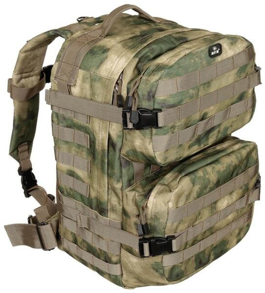 US hátizsák, Assault II, HDT-camo FGszabályozható, párnázott vállpántok fém D-gyűrűkkelállítható, levehető mell- és derékpántokpárnázott hátsó rész légáteresztő hálós anyagból készültés egy nagy, becsúsztatható rekesz horog- és hurkapapucsos rögzítővel a folyadékpótló csomag számára1 felső